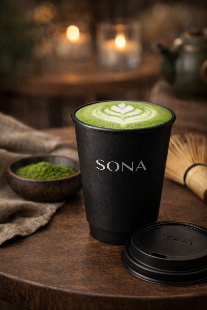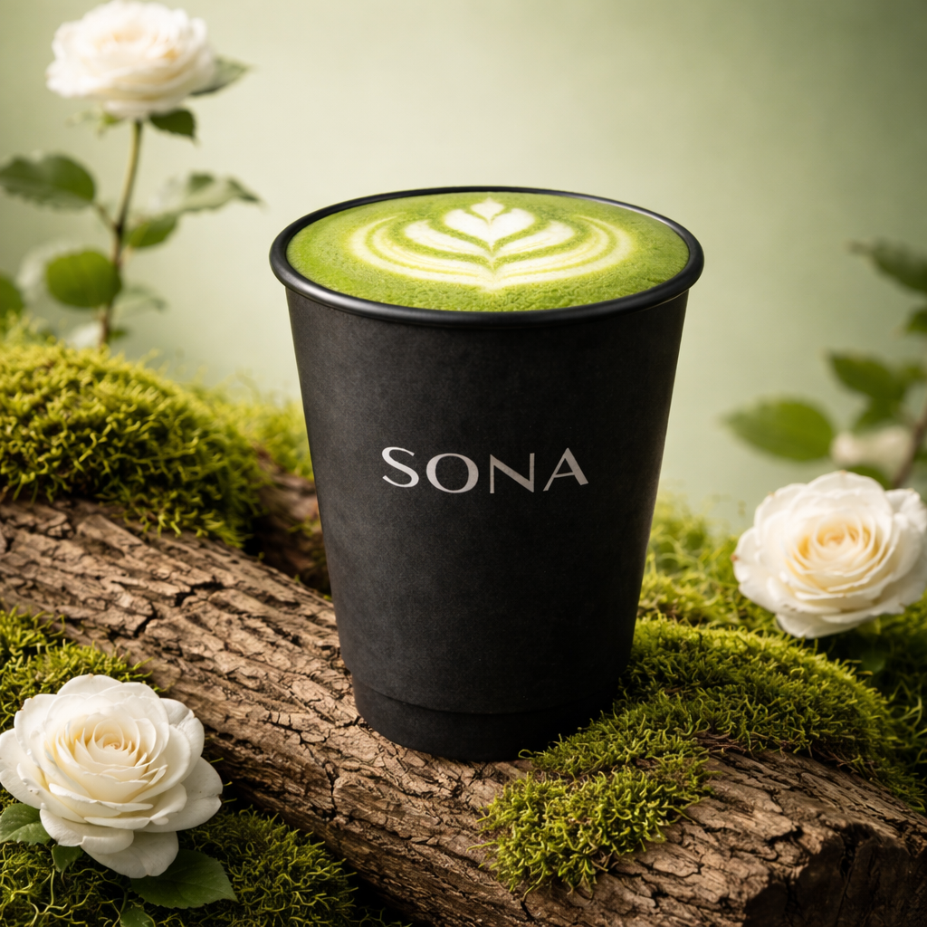SONA bietet eine kuratierte Auswahl an Getränken: Espresso & klassische Kaffees, Cappuccino & Latte, Matcha Latte, Chai Latte, Frappé